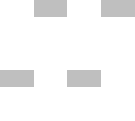 - 예를 들어, 첫줄에 2개의 정사각형과 두번째 줄에 3개의 정사각형이 있는 폴리오미노의 모습은 아래의 그림과 같이 총 (2 + 3 - 1 = 4) 가지가 존재한다.